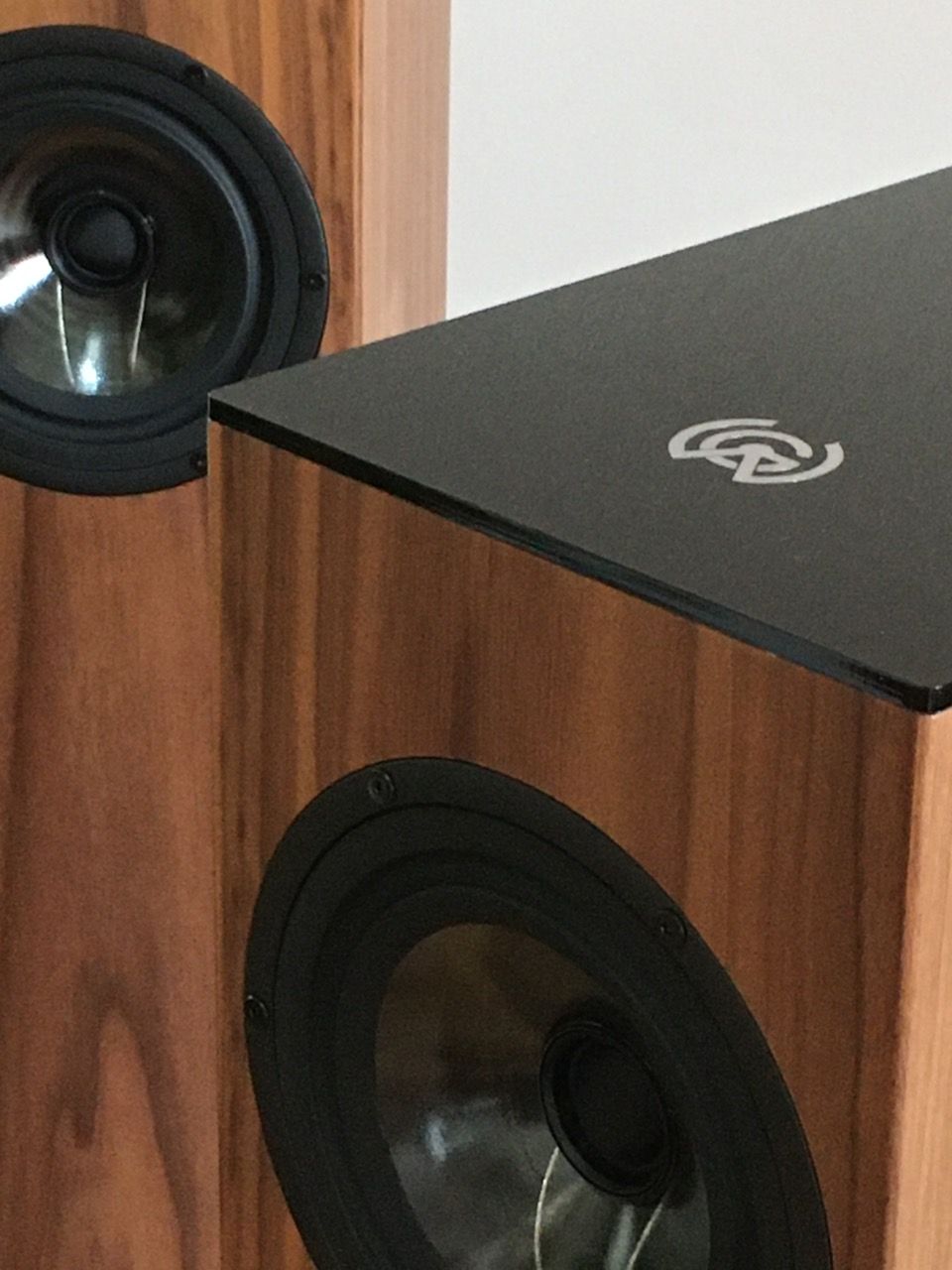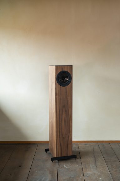 Das Acrylglas mit dem W&G Logo und die neuartige Fußkonstruktion bilden zusammen mit dem Koaxialchassis den technisch modernen Rahmen um das natürliche Holz.